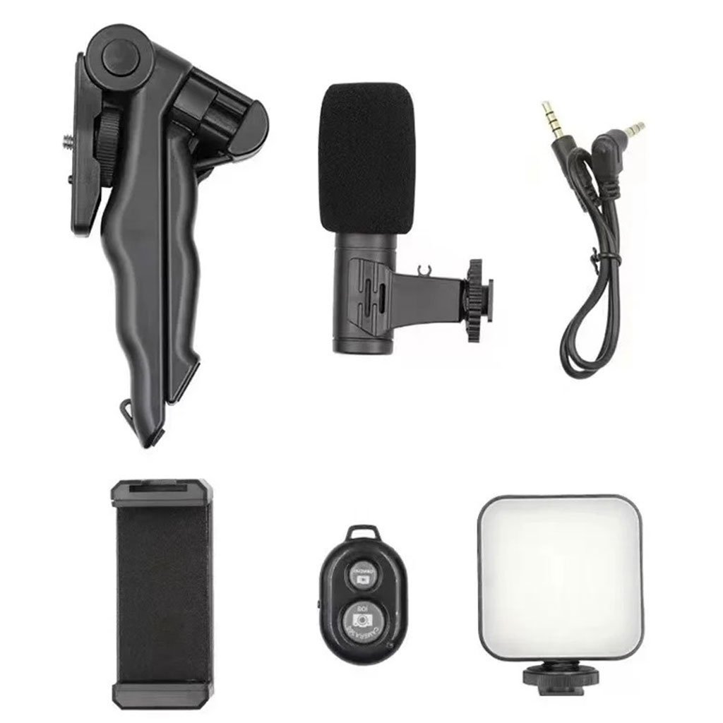 Le kit comprend un trépied pliable qui peut servir de poignée, un microphone universel, un support pour téléphone, une lumière LED et une télécommande.